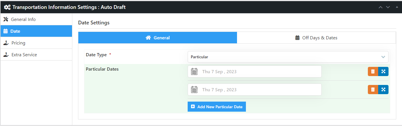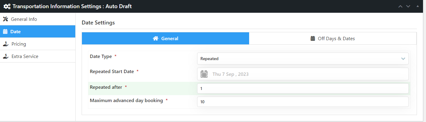 General tab: There are two options in date type one is Repeated and another is Particular. In repeated date have three fields Repeated Start Date, Repeated after and Maximum advanced day booking. And Particular date you can add multiple specific date.