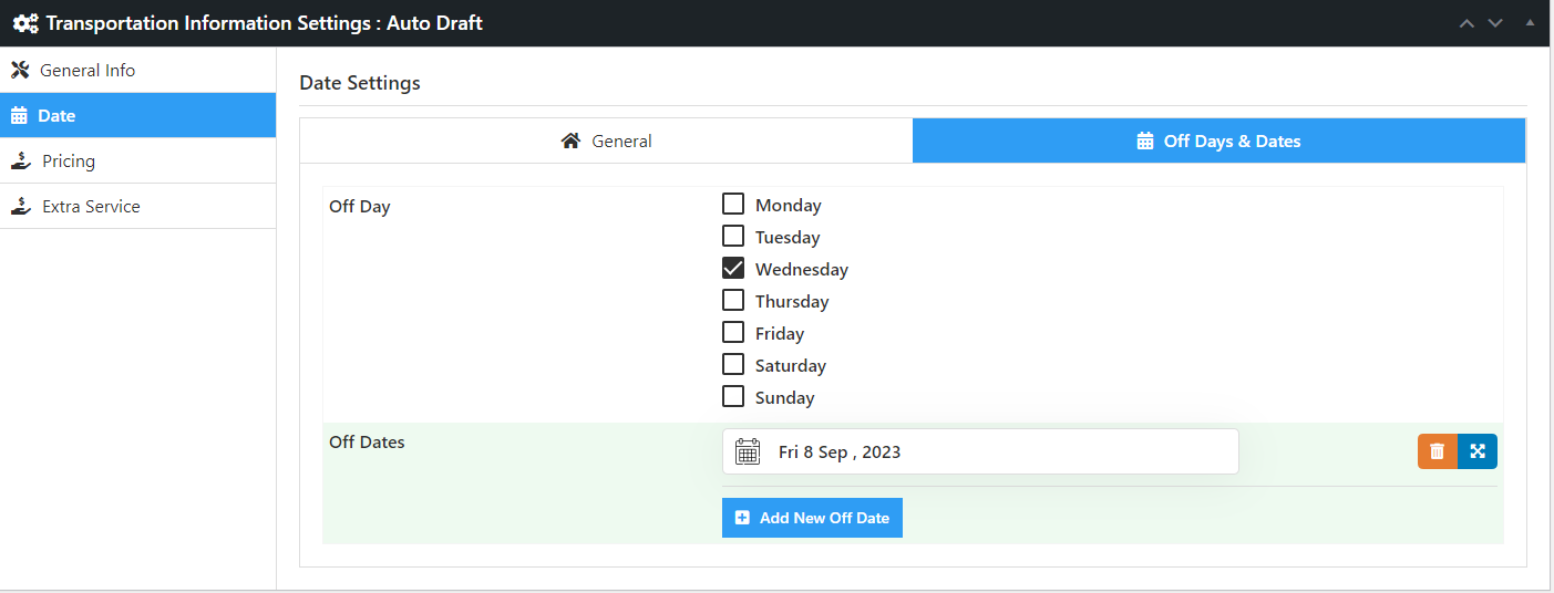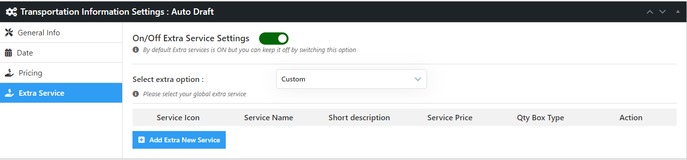 In Extra services tab you can add your transport extra service. By default you’ll see two field one is “On/Off Extra Service Settings”  which is by default enable and another is  “Select extra option “. If you want to extra service of your transport then you go to “Select extra option” field by keeping enable  “On/Off Extra Service Settings”.  In “Select extra option” select option field contains two values on is Custom and another is  Pre-defined Extra Services. By default select Custom value and you can add extra service with pricing and related option by clicking “Add Extra New Service” button. If you select “Pre-defined Extra Services” you’ll see extra service related dummy input. You can update this as your required.