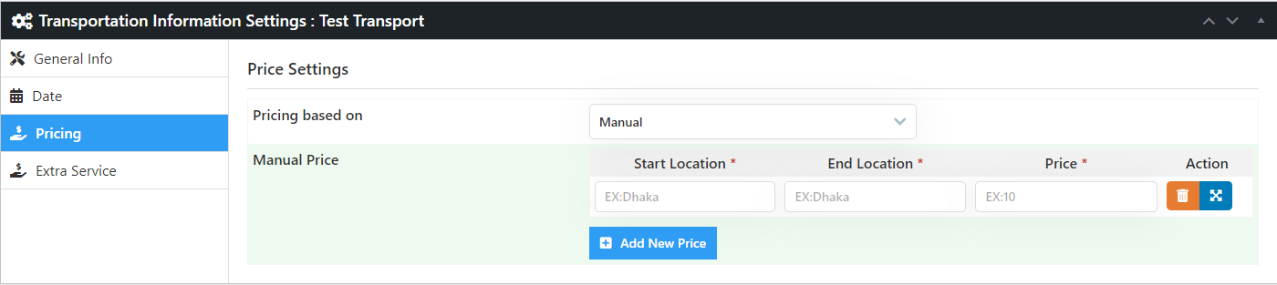 And last on is manual, if you select this option then you’ll see Manual Price option which contains start location, end location and price.