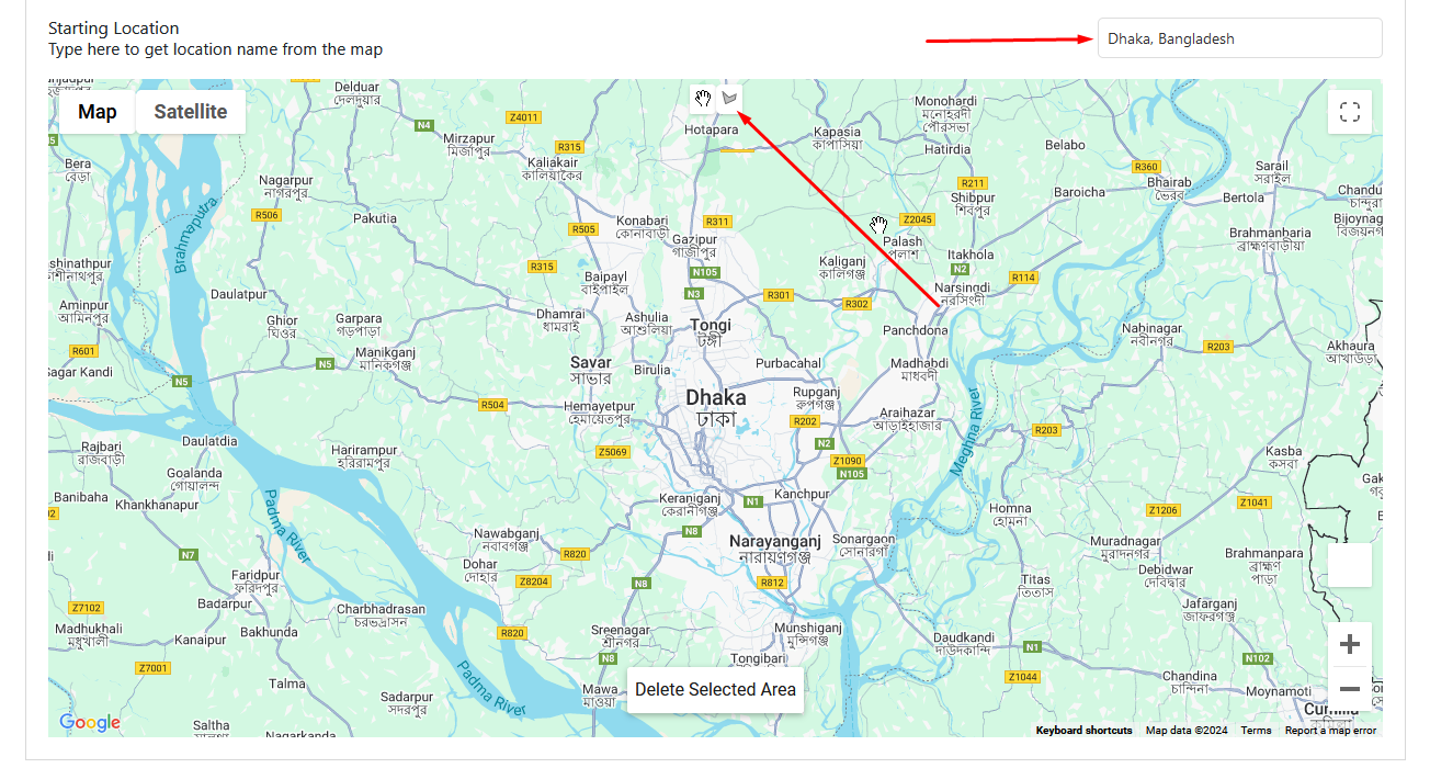 5. Click on the draw a shape icon to enable the tools and draw your service area. Follow the images to select the area. The selection should be closed by the drawing.