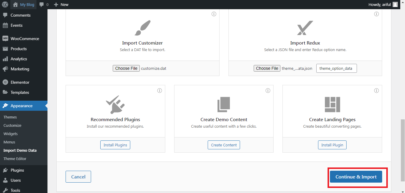 STEP-2: Select Content.xml, widgets.wie, customize.dat, and theme_option_data.json file from your local directory. You’ll find the files inside the Vaincode theme bundle.