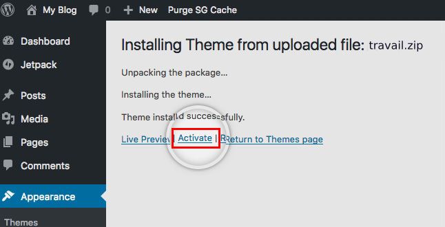 Please log in to the WordPress admin dashboard to upload and install the Travail theme.